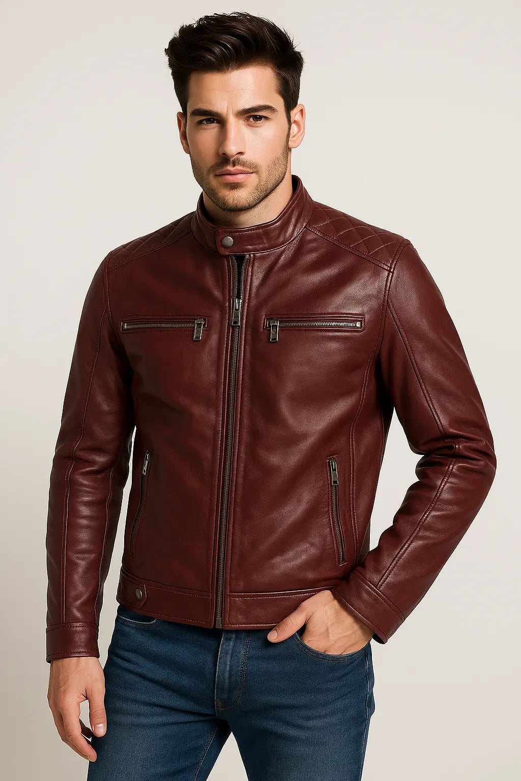 This burgundy men's leather jacket is the ultimate choice for the discerning man seeking a durable and versatile statement piece.